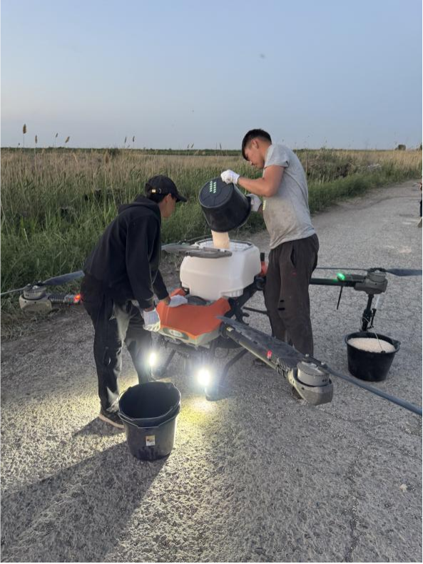 作业前,我们与农户进行了详细的沟通,了解农户作业需求,精确到每公顷的播撒重量,通过遥控设置好无人机的飞行参数,定制飞行高度、航线密度、下料速度参数,严格按照标准实施作业。